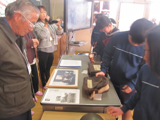 お話の後、戦争中に使われていた当時の鉄砲、鉄兜、衛生兵の持ち物なども持ってきてくださり、間近で見せていただく機会もありました。