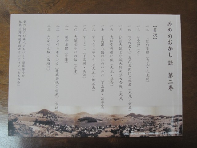 先日「ももの会」の方が作成した「みののむかし話 第2巻」を各家庭へ持って帰ってもらったと思います。低学年の子どもは、まだ自分で読むのも難しいと思いますが、親子で読み聞かせをしてくださると、ふるさとのことがもっとよくわかり郷土を愛する子どもが増えるのではと思います。