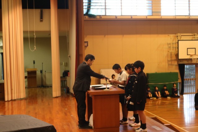 先日の児童会選挙で新しく児童会役員に選ばれた4名に任命書が渡されました。