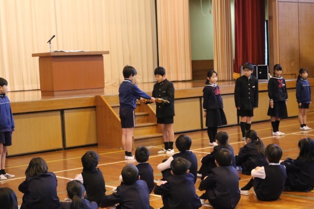 また、6年生の児童会役員から新しい役員へ児童会のカギの引継ぎがありました。