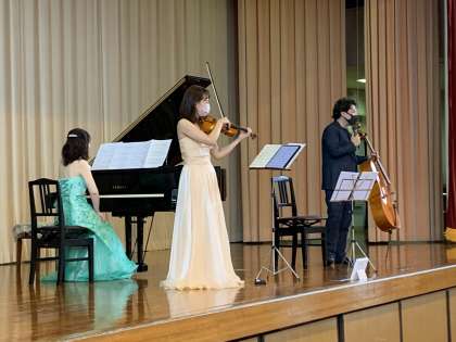 プロの演奏家の方々が生演奏を聴かせて下さいました。バイオリン、チェロ、ピアノのアンサンブルです。初めて聴く美しい音色に、子どもたちはうっとり聴いていました。