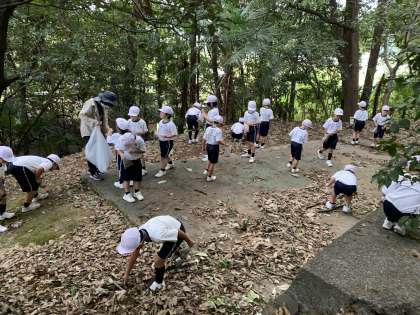 南門から出ると、ちょうど幼稚園児たちも探しに出てきたところでした。しばらく一緒にその辺りに落ちている秋を探していました。大きなクヌギの葉やどんぐりをたくさん見つけました。