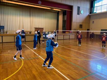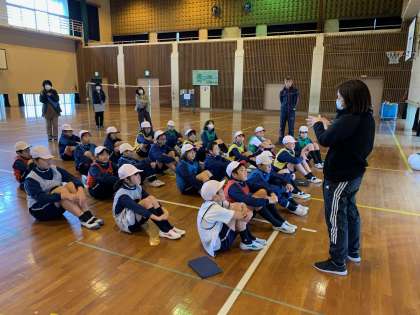 チームの連携による簡易化されたゲーム(バウンドキャッチ)を行いました。みんなが楽しめるようにルールを工夫したものです。