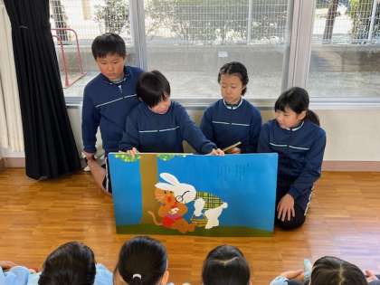 今日、5年生が幼稚園の年長さんと交流しました。夏にプールで交流して以来なので、とても楽しみにしていました。今回は絵本の「読み聞かせ」です。