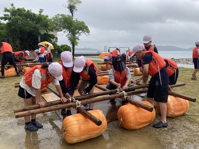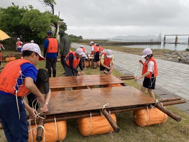 朝から雨が降る中でしたが、頑張っていかだづくりに挑戦しました。