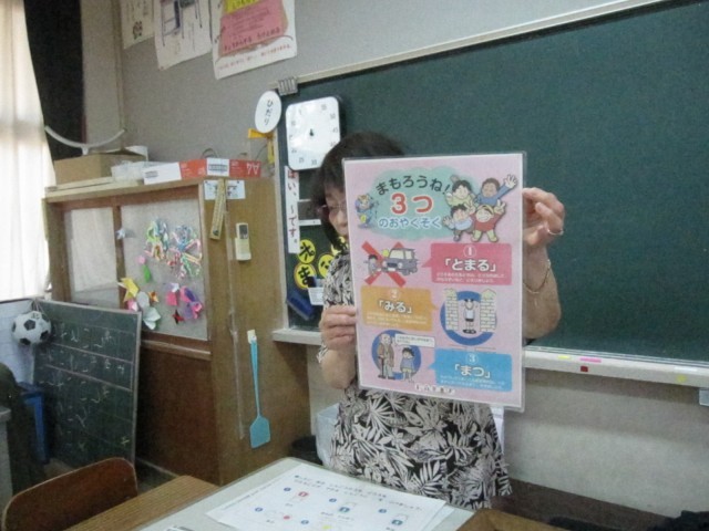 紙芝居を見て、「飛び出さない。信号のある交差点も右左をよく見てわたる。無理して渡らない。」などを確かめました。
