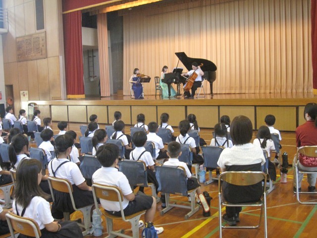 四国電力が母体のよんでん文化振興財団から派遣された、ピアノ、ヴァイオリン、チェロの3種類の楽器の演奏者がやってきてくれました。3人の演奏者がクラッシックから子どもたちの知っている曲まで演奏を聞かせてくれました。