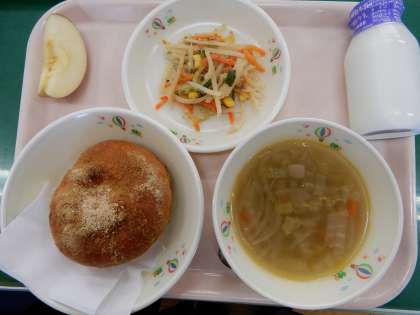 今日の給食には、きなこ揚げパンが出ています。地域によって細長い揚げパンと丸形の揚げパンがあります。大見小学校は丸形の揚げパンです。みなさんはどちらの揚げパンが思い出にありますか?