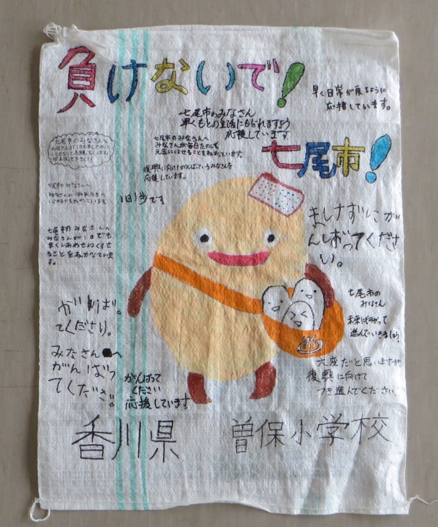 仁尾中学校からの呼びかけで、全校生の応援メッセージを書いた土嚢袋を作り、中学校へ手渡しました。連休中に七尾市まに届けていただけるということでした。1年以上も大変な思いをしている方々の少しでもお役に立てればと思います。