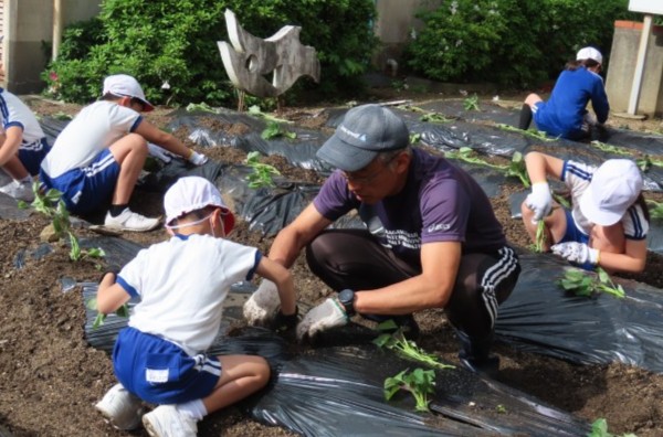 朝の活動の時間にサツマイモのつるさしを行いました。