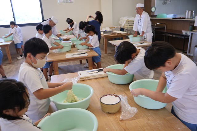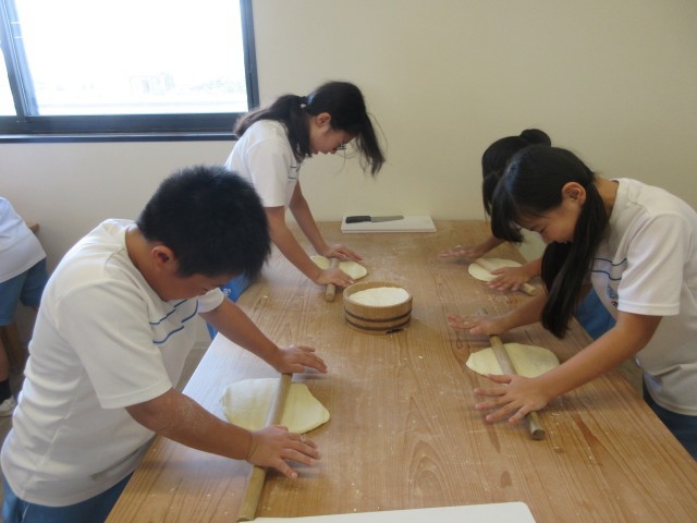 プロの職人さんの指導の下、粉からうどんを作りました。生地をこねて、めん棒で伸ばし、包丁で切る作業は、思っていたよりも大変でした。みんなで「よいしょ、よいしょ!」と声をかけながら一生懸命取り組みました。太さが不揃いだったり、短いものがあったりしましたが、自分たちが心を込めて作ったうどんはいつも以上においしく、完食しました。
