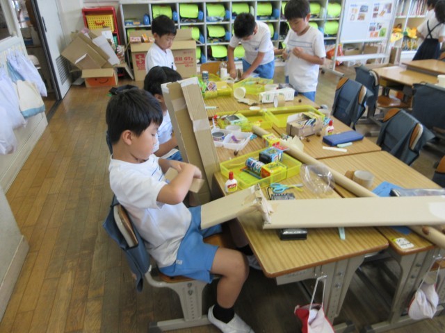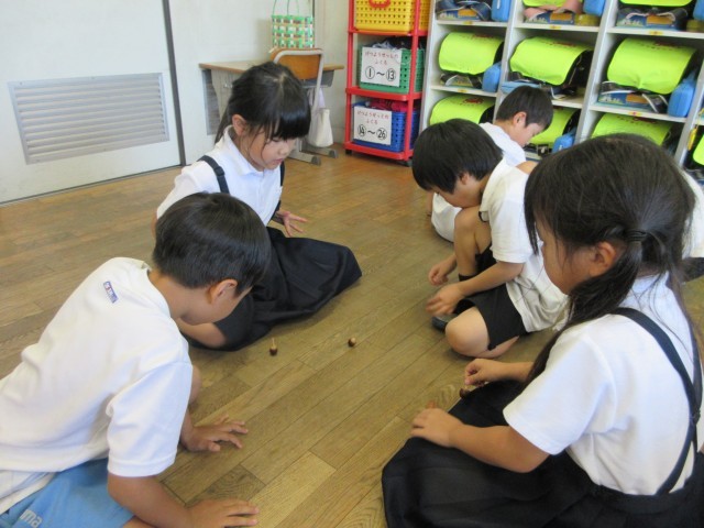 どんぐりやまつぼっくり、空き箱を使って、おもちゃ作りをしました。「どうしたら楽しくなるのかな?」「うまくいくにはどうすればいいのかな?」と考えながら、工夫して作る姿が見られました。出来上がったおもちゃで、楽しく遊びました。