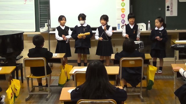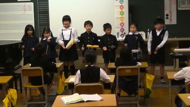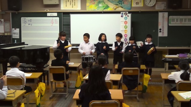 音楽で、「かぼちゃ」の曲があります。「畑に大きなカボチャができた。どれくらい。一人じゃはこべない・・・。」という曲です。どんどん人数が増えていきます。子どもたちで、演奏する楽器(タンバリン、トライアングル、小太鼓など)を決め、みんなで心を一つに歌ったり、演奏したりしています。リズムよく楽しく演奏できていて、とても上手です。