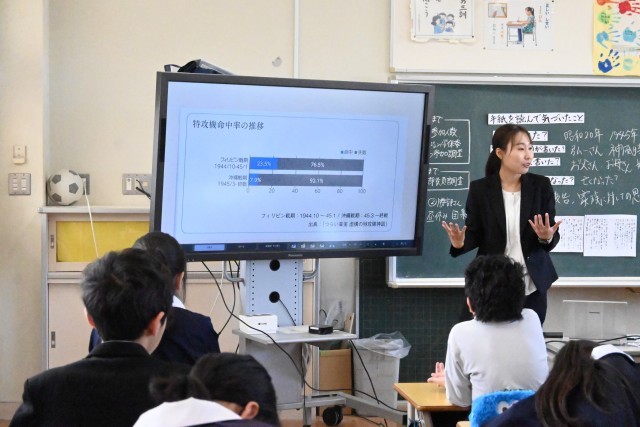 勝部先生は、戦時中の詫間町の様子に関心をもたれ、実際に地域の方と関わったり現地に足を運んだりしながら研究を深めてこられました。今日は、詫間町から特攻隊が出撃した事実を、本人が家族に宛てた手紙や、ご家族の証言などをもとにして授業してくださいました。