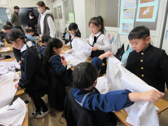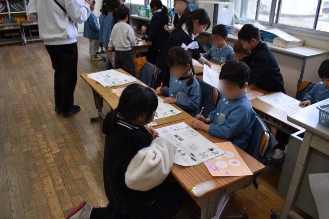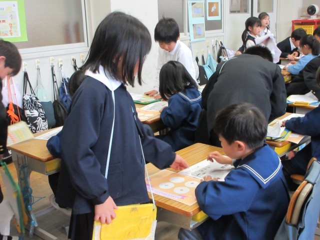当日は、学校行事の紹介したり、エプロンのたたみ方や鉛筆の持ち方など、学習や生活の仕方を説明し、体験してもらったりしました。手をつないで案内したり、「上手だね」と声をかけたり、優しい姿がたくさん見られました。