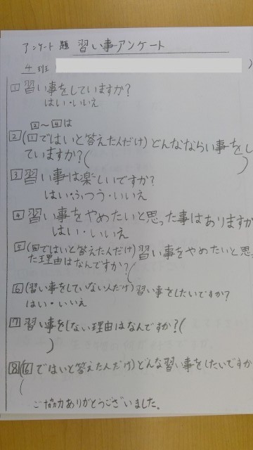 4年生は国語科「調べたことを報告しよう」の学習で、日常生活の疑問について班ごとに調査を進めています。「習い事をしている人はどのくらい?」「好きなスポーツは?」など、身近な問いに対して、自分たちで一生懸命に作成したアンケートをクラス内で実施しました。試行錯誤して作った質問用紙を配り、友達に回答してもらいました。今後は、回収した紙を一枚ずつ集計し、表やグラフにまとめて報告書を作成します。