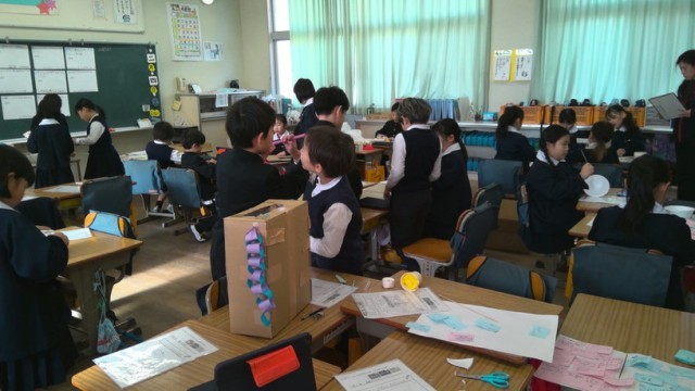 2時間目には、竹組のIBの授業公開を行い、子どもたちのがんばっている授業の様子を校内の先生方が参観しました。「1年生が楽しく遊べるようにおもちゃをレベルアップしよう」と、どのグループもおもちゃの材料を変えたり、ゴムなどの本数を増やしたり試行錯誤しながら協力して行えました。もうすぐ完成予定です。1年生が楽しめるようにと相手を思いやる気持ちも、より高まったすてきな2年生です。