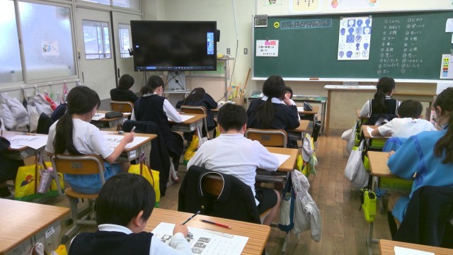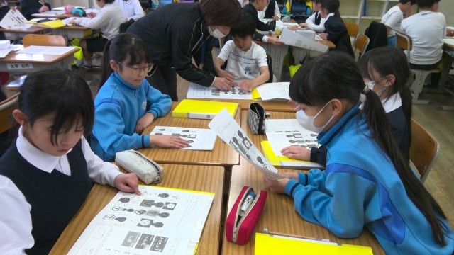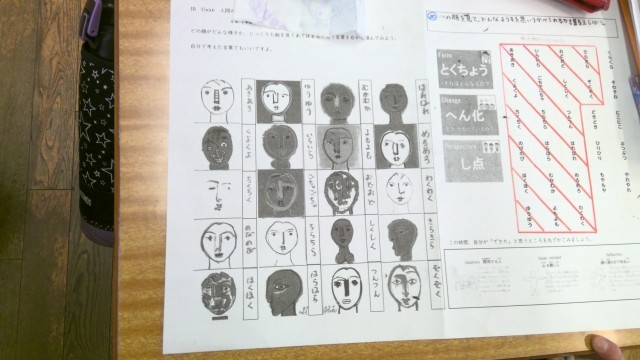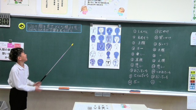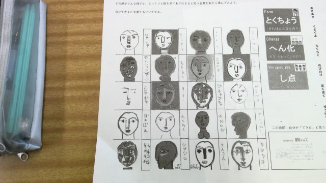 今日の総合的な学習の時間(IB学習)に猪熊弦一郎さんの作品「顔20C」を使って学習を進めました。20の顔は一見よく似ていますが、よく見ると全く違います。その顔にふさわしいオノマトペの言葉(くらくら、おどおど、きらきら等)を選んでいきました。一人ひとりが思い描いた感じ方の違いを共有する時間には、共感する姿や驚く様子などが見られました。また、この顔の表情を真似て、猪熊さんがどんな気持ちで描いたのか想像を膨らませていた子もいました。次回は、アートカードを使ってまた違うアートの世界に入りたいと思います。