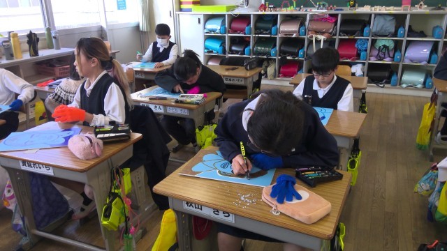 4年生は図工で版画をしています。今日は彫刻刀デビューでした。事前に安全な使い方を指導した後行いました。彫刻刀の持ち方、彫る向き、版木の回し方などを覚えた後彫り始めましたが、「うわー、楽しい。」「上手く彫れた!」と、思わず声を発する子もいました。初めてのことに挑戦する表情は、笑顔の中にも真剣さがありました。慣れてきた頃こそ、慎重に怪我のないように進めていきます。運動会で使った懐かしのカラフルな手袋を付け、4年生らしい可愛い写真が撮れました。