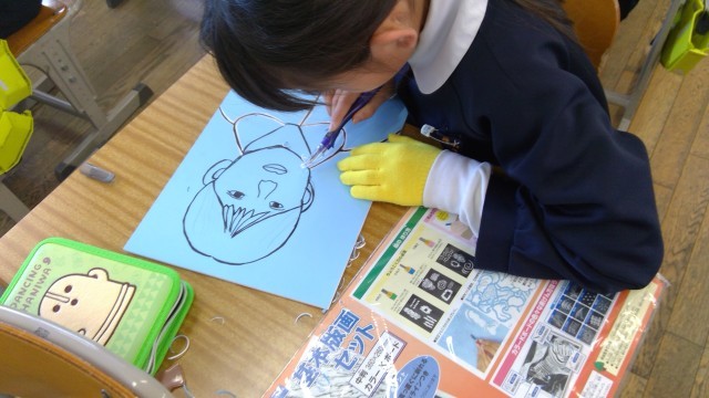 図工の時間、4年生は自画像の制作に取り組んでいます。