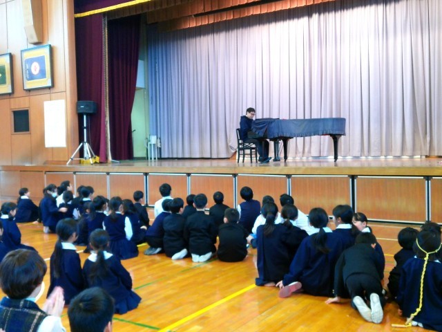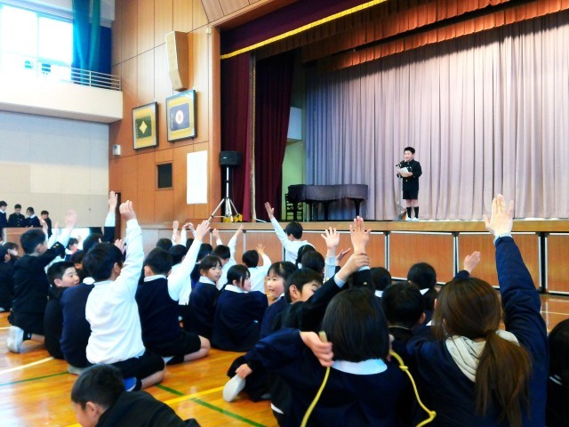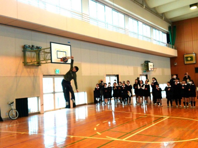 大会の最後には、卒業生を送り出したばかりの6年生担任の先生方が飛び入りで出場してくれました。原先生のダンクシュートに歓声が上がり、亀井先生の英会話に驚き、秋山先生のピアノ演奏にくぎ付けになっていました。6年生の先生方、ありがとうございました!!