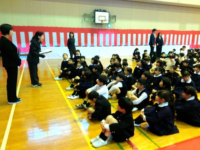 この時点では、自分がどの学級かは知りません。しっかり背筋を伸ばしてキラキラした目で話を聞いていますね。(1枚目)この後、各学年団に分かれて、新しい担任の先生から学級発表がありました。(2.3枚目)