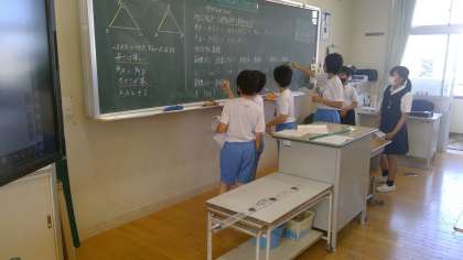 本日の2時間目。6年梅組さんは、算数の授業です。この時間は「合同な図形」の復習をしてから、「合同な図形と拡大した図形は何がちがうのか?」という学習問題を、子どもたち自らが作って学習に取り組んでいます。さすがは最上級生らしい立派な学習ぶりです。