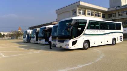今日は、秋の遠足です。運動場にはバスが並びました。毎年、この景色は心がおどりますね。それでは、間もなく出発します。遠足の様子については、後日お知らせします。