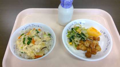 本日の給食 公開日 2021/10/12 更新日 2021/10/12 学校全体 親子丼 牛乳 高野豆腐の唐揚げ 三色和え 柿 今日は、これから出張です。急いでいますので、コメントなしをお許しください。