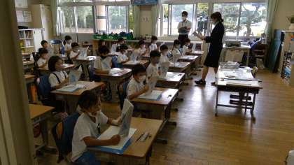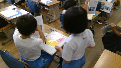 本日の2時間目。1年竹組さんは国語の授業です。しかも、今日は、香川県教育センターの指導主事さんが来校しての研究授業です。「いろいろな ふね」のお勉強です。フェリーボートは、どんな船なのかを読み取っています。「何のための船?」、「中には何があるの?」、「人がすることは?」という3つのことについて見つけていきます。