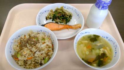 大人気メニューの「肉もっそ」です。今日は、風の吹き加減にも影響されてか、きっと肉もっそを作っているのだろうと想像できる甘いじょっぱい、いい香りが体育館周辺に3時間目辺りから漂っていました。そのせいか、3時間目の始め頃なのに、「お腹すいた!」と言っている子どもたちもたくさんいました。自校に調理場がある学校でなければ経験できないことですね。