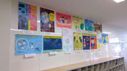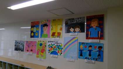 6年生では、人権をテーマに、ちょっとした悪口が相手を傷つけることや他者の長所を認めようとすることなど、それぞれの思いをポスターで表現しました。全校に広げようと、作品を児童玄関に掲示しています。