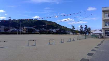 昨日、万国旗を張りました。少し早いのですが、今年度は通常の運動会ではないので、特別な準備の時間は設定していません。そこで、日々、少しずつ準備を進めています。運動会の雰囲気を少しでも感じていただけたらと思い、昨日、がんばって張りました。