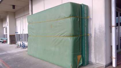 走り高跳び用のマットを、体育館の軒下に収納できるようにしました。