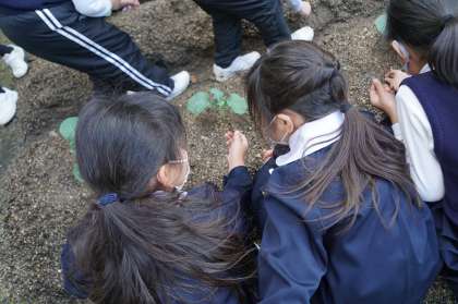 張り切って外に飛び出した子どもたち。農園に入ると、「草が生えとる。抜こう!」と、お世話をしたり、「先生、ここ見て。ここだけキャベツみたいになっとる。」と、発見したり、時間がたつのも忘れて、活動しました。寒くなってきましたが、教室の前の農園では、熱心な、子ども同士の情報交換が行われました。