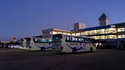 集合完了時刻前の校庭の様子です。いよいよ、修学旅行が始まります。