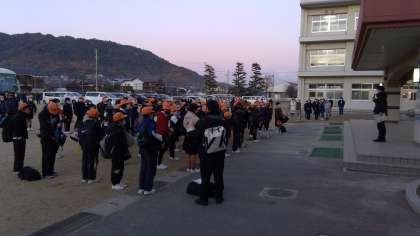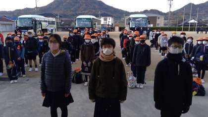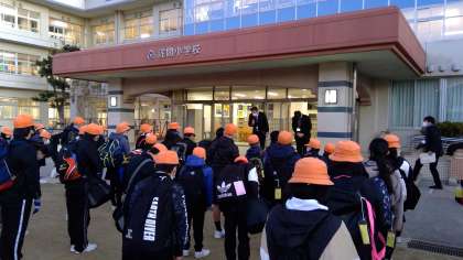 出発式の様子です。各学級の代表者から立派な決意の言葉をいただきました。お見送りのお家の方、先生方に挨拶をして、いよいよ出発です。