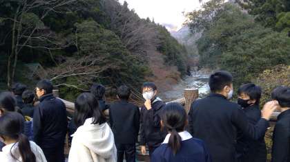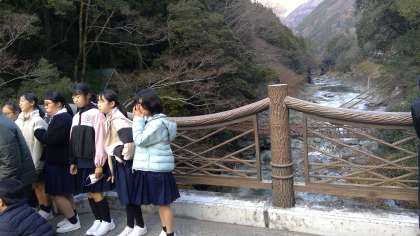 予定通り、16:00頃、最後の目的地の「かずら橋」に到着しました。記念撮影の後、かずら橋を渡ります。