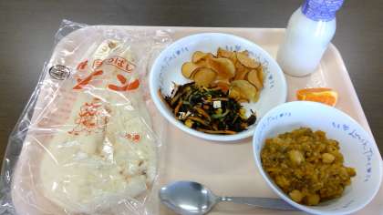ナンとキーマカレー 牛乳 ひじきのマリネ ダブルいもチップス せとか