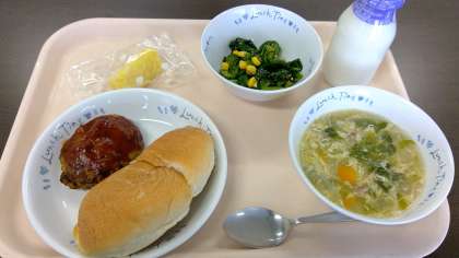 米粉パン 牛乳 手作りハンバーグ ほうれん草とコーンのサラダ レタスと卵のスープ パインアップル(袋入り)