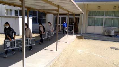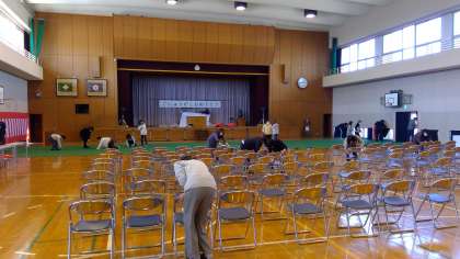 4月5日(火)の午後2時です。教職員で、明後日の入学式の準備をしています。紅白幕を張って、じゅうたんを敷いて、椅子を並べて・・・。教職員が力を合わせてがんばっています。