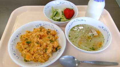 チキンライス 牛乳 春野菜サラダ ABCスープ いちご