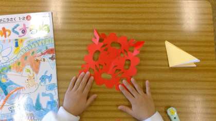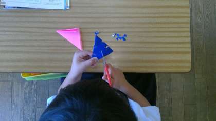 折り紙をおって、おって、おって。