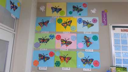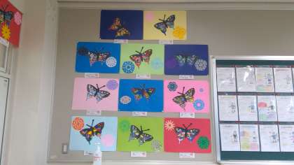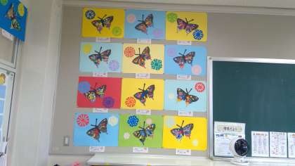 図工で「不思議な蝶」の絵を描きました。これまでは、背景の色塗りをしたことはありましたが、細かい模様を塗るのは初めてです。色を濁らせないためには、筆をきちんと洗うことが一番大切です。道具の使い方も、みんなで確認していよいよ色作り。お気に入りの色がたくさんできてみんな大喜びです。はみださにように気をつけながら、少しずつ色を変えて丁寧に色を塗り華やかな蝶がたくさん誕生しました。蝶の周りには切り紙のお花を飾りました。1つ1つの作業を丁寧に行ったおかげで、美しい蝶の絵が完成しました。