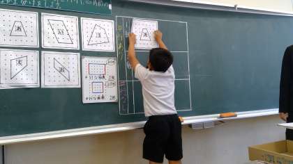 いつもの「授業風景」ではなくて、今日は特別「研究授業バージョン」です。本日の2時間目。4年竹組さんは算数の研究授業です。今日は、四角形の「平行な辺の組」に着目して仲間分けをする学習です。