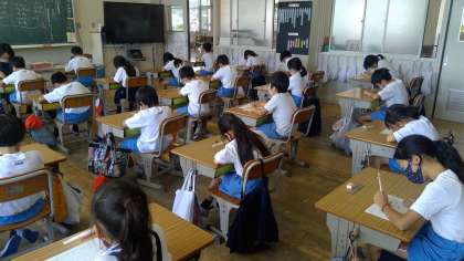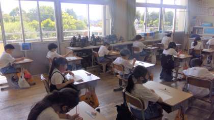 3年梅組さんは、全員がしっかり考えてテストに取り組んでいます。教室はシーンとしたとても落ち着いた雰囲気です。教室の窓からは、さわやかな風が吹き込んできて、とても涼しいです。