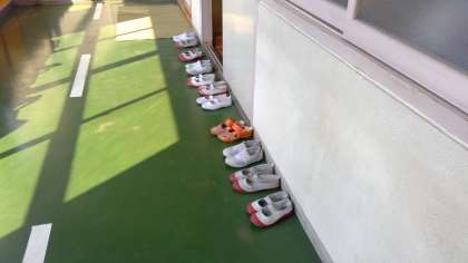 和室の前に来ますと、ビシッと並んだ上靴。これを見ただけで、お茶クラブのお作法が分かるような気がしました。正座、姿勢、歩き方、お菓子のいただき方、お茶の点て方と、本格的なお勉強ができるクラブです。