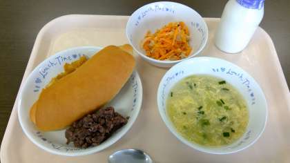 そのあんパンに近い「あんサンド」と、本当にサクサクと音を立て続ける「魚のサクサク揚げ」と、にんじんが苦手な人も間違いなくおいしく食べることができる「にんじんサラダ」と、野菜たっぷりの「たまごスープ」をおいしくいただきました。