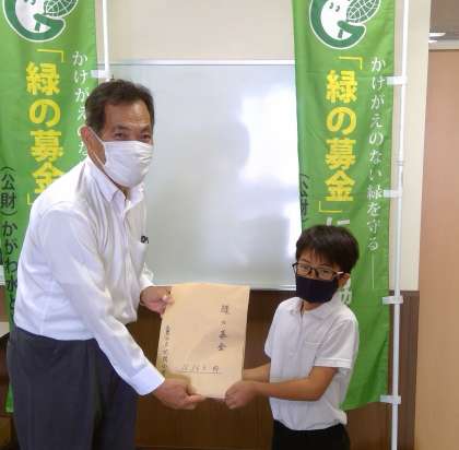 募金は銀行振り込みでもよかったのですが、財団の担当者がわざわざ来校されました。飼育園芸委員長さんが、募金総額16,163円が入ったずっしりと思い封筒を、財団の担当者に手渡し「緑化活動に役立ててください。」と挨拶もしました。