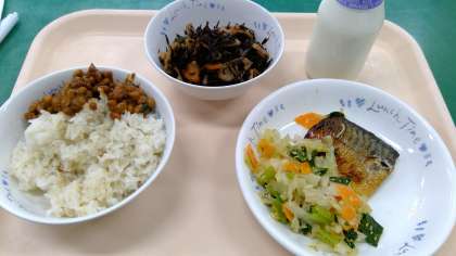 麦ご飯、牛乳、鯖のゆうあん焼き、ひじきの炒め煮、 野菜のごま和え、納豆みそ